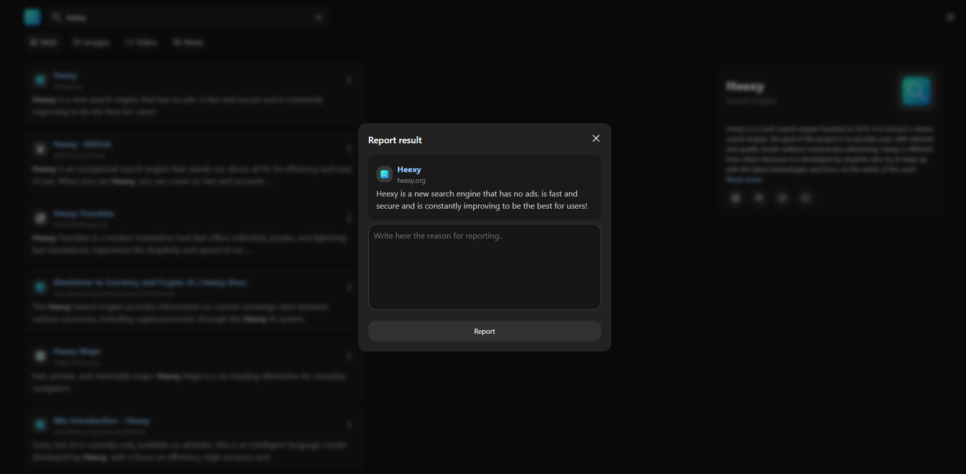 Your report will be reviewed by the Heexy team, and appropriate action will be taken if necessary. We appreciate your help in keeping Heexy a safe and reliable search engine.