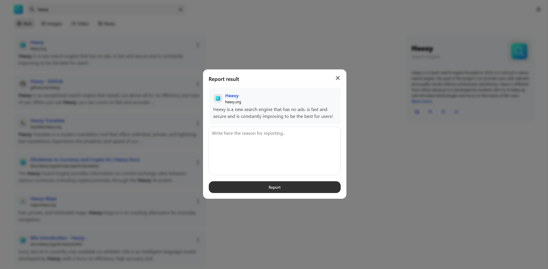 Heexy allows you to report search results that you believe are inappropriate, misleading, or harmful. This helps us maintain a safe search experience for all users.